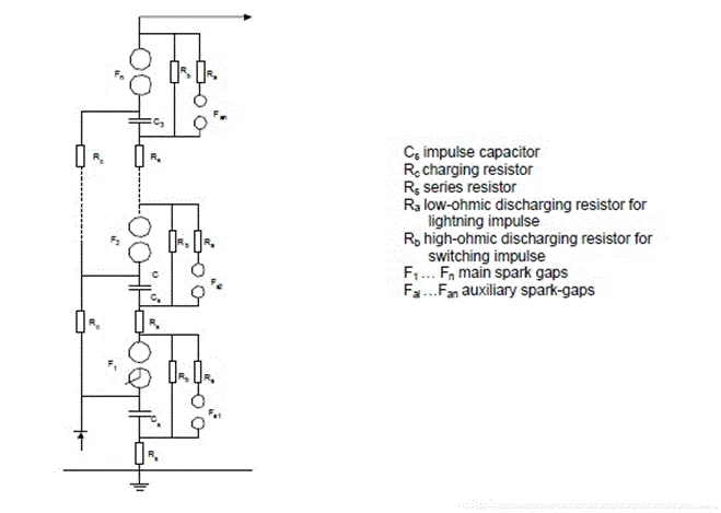 Rc (28 kΩ) (höchstzulässige Ladespannung 200 kV). Wenn die Ladespannung den erforderlichen Wert erreicht hat, wird der Durchschlag der Funkenstrecke F1 durch einen externen Triggerimpuls ausgelöst. Wenn F1 durchschlägt, steigt das Potential der folgenden Stufe (Punkt B und C). Da die Serienwiderstände Rs im Vergleich zu den Entladewiderständen Rb (4,5 kΩ) und dem Ladewiderstand Rc niederohmig sind und da der niederohmige Entladewiderstand Ra durch die Hilfsfunkenstrecke Fal vom Stromkreis getrennt ist, steigt die Potentialdifferenz über der Funkenstrecke F2 erheblich und der Durchschlag von F2 wird ausgelöst.