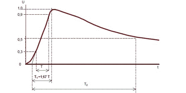 Der Test wird mit standardisierten Blitzimpulsen negativer Polarität durchgeführt. Die Stirnzeit (T1) und die Zeit bis zum Halbwert (T2) sind gemäß der Norm definiert.